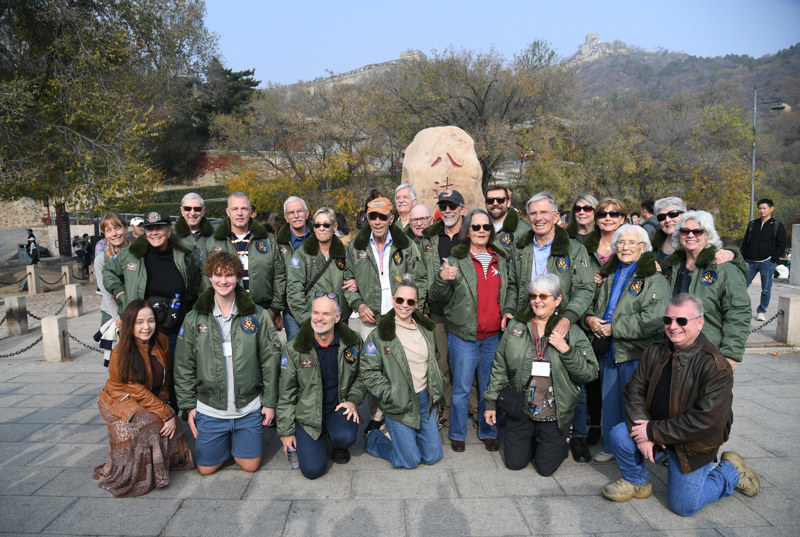 2023年10月29日,飞虎队老兵莫耶一行人在北京八达岭长城合影留念。新华社记者 任超 摄